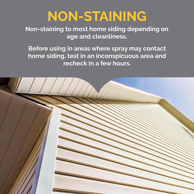 - NON-STAINING: This product is non-staining to most home siding depending on age and cleanliness – before using in areas where spray may contact home siding, test in an inconspicuous area and recheck in a few hours.