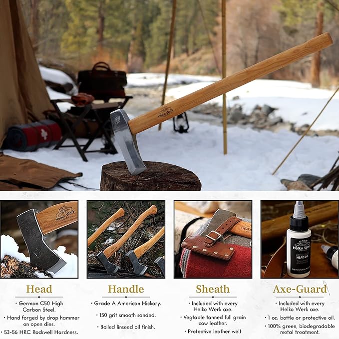 - Includes Full Grain Leather Sheath and 1 oz Bottle of Axe Guard Protective Oil: All Helko Werk axes and hatchets include a vegetable-tanned premium leather axe sheath to protect your axe blade and head. The Axe Guard oil is a metal protecting oil to help maintain the steel of your axe head, and prevent rust over time.