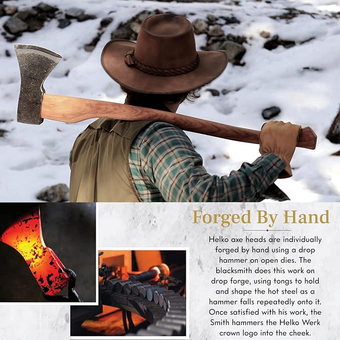 - C50 High Carbon Steel: 53-56 HRC - Helko Werk axe heads are open-face drop forged individually by hand from German C50 high grade carbon steel. Drop forging is a process in which the blacksmith uses tongs to hold and shape hot steel as a drop hammer falls repeatedly onto it.