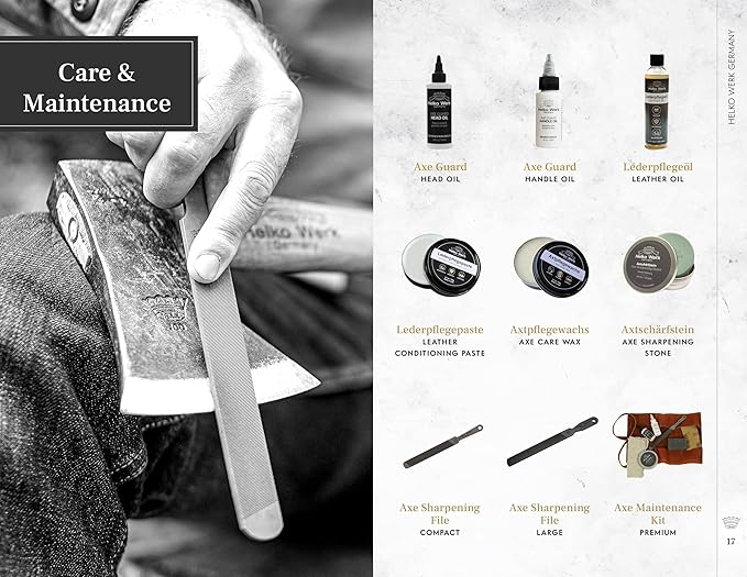 - Includes Full Grain Leather Sheath and 1 oz Bottle of Axe Guard Protective Oil: All Helko Werk axes and hatchets include a vegetable-tanned premium leather axe sheath to protect your axe blade and head. The Axe Guard oil is a metal protecting oil to help maintain the steel of your axe head, and prevent rust over time.