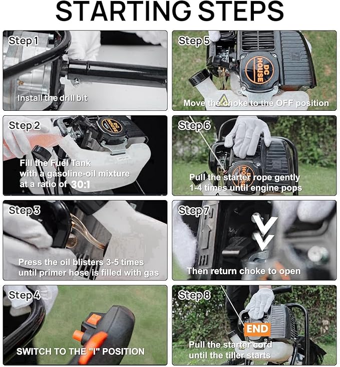- Comfortable to Operate - 1. Manual recoil easy start. 2. Can be handled by one or two people easily for a wide variety of digging tasks. 3. Ergonomic butterfly handles, The emergency stop switch is conveniently located on the handle for quick shutdown.