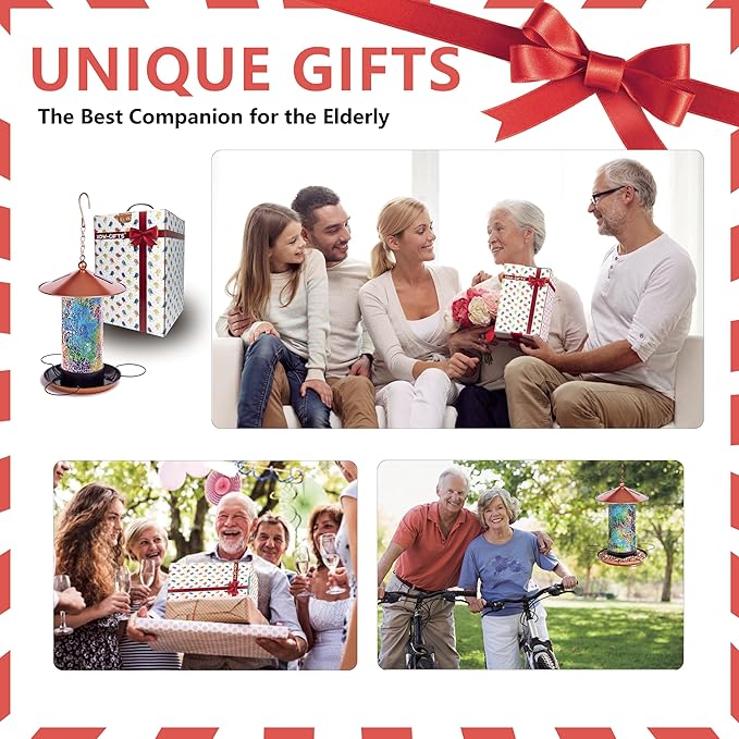 - 【BEAUTIFUL GARDEN DECOR】: The bird feeder hanger is designed with vintage lantern shapes and hand made mosaic glass pieces, the cap and base are made of sturdy copper-tone metal. The glass is transparent enough to reflect different sunlight beautifully under different light condition, perfect and beautiful decoration for your garden, backyard;This feeder is easy to fill bird seed;
