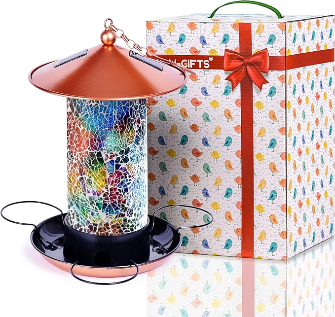 XDW-GIFTS Mosaic Solar Wild Bird Feeder, Waterproof Lantern Shape with S-Hook & 4 LED Lights, Garden Decor for Lawn, Patio, Balcony, Yard Ornament - Unique Gifts for Mom, Women, Grandma, Bird Lovers