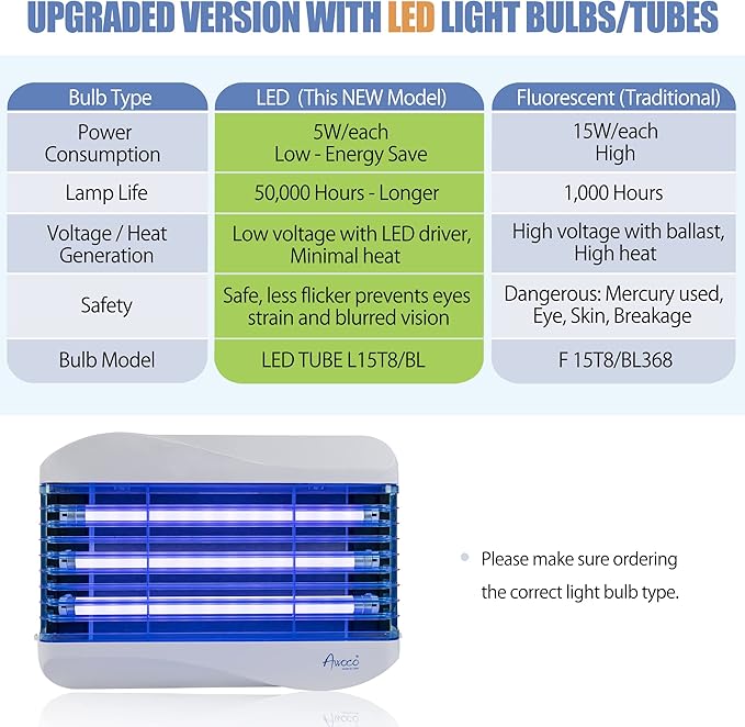 - [Upgraded Version with LED UV Light] - New upgraded LED UV lights are more energy efficient than fluorescent light bulbs while providing a brighter lighting. Save money and maintenance cost with these new LED UV lights that are more durable and don’t flicker near the end of their life. No flickering prevents eye strain and blurred vision compared to fluorescent light bulbs.