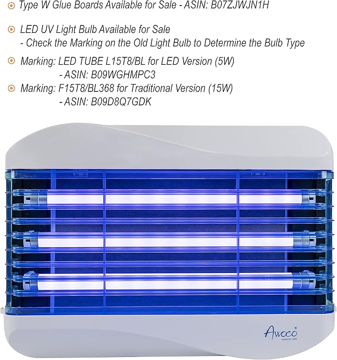 - [1 Year USA Limited Warranty on Fly Trap] - LED bulb is consumable depending on power condition which is a 3 months warranty. If the lightbulb fails within 3 months, contact us for a free LED bulb replacement limited to USA only. Awoco has LED bulbs and glue boards available. Lamp Overall Dimensions: 21-3/8"W x 4"D x 14-1/4"H. Glue Board Dimensions: 15-5/8" x 10-5/8".