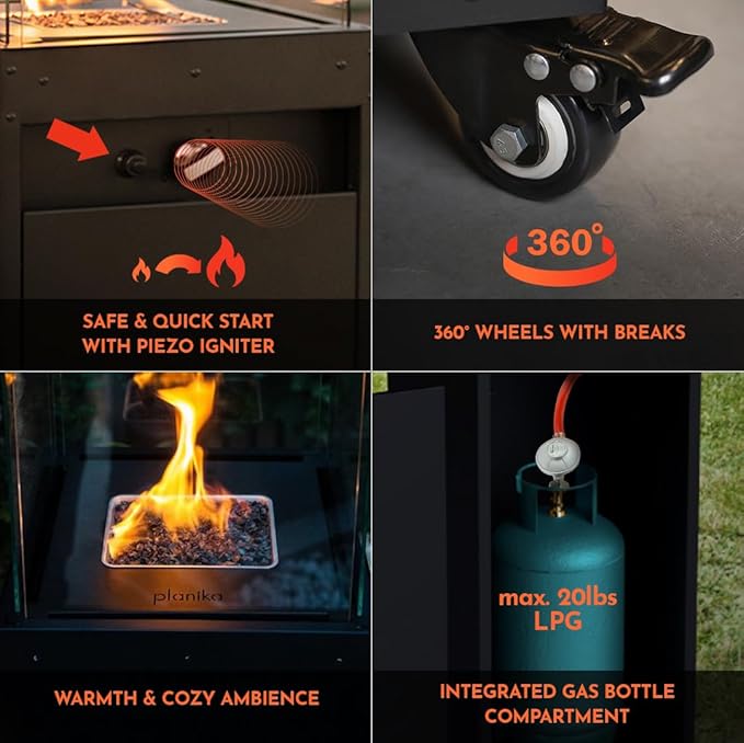 - ✅【CSA&CE SAFETY 】 Planika outdoor propane fireplaces meet or exceed CSA safety and performance standards in the US and Canada as well as the CE declaration of conformity (EU 2016/426) tested by Kiwa Laboratories.