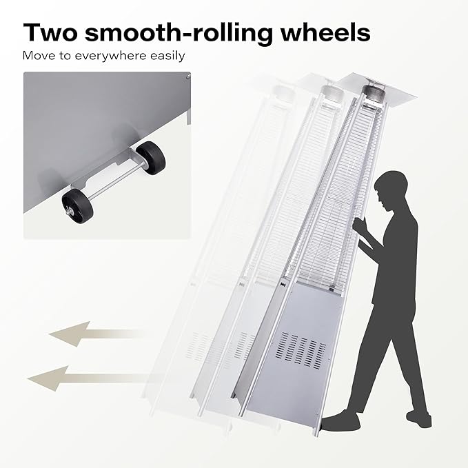 - Wheels for Smooth Mobility - This outdoor propane heater features two smooth-rolling wheels, making it easy to transport the outdoor heater from the poolside to the patio or from one side of the deck to the other.