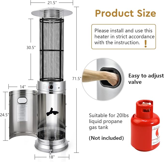 - Assembly Required: The assembly is not that difficult as the heater is equipped with complete accessories and a detailed instruction. To make this heater work, you need to purchase a 20lbs propane cylinder tank by yourself. The overall dimension of the heater is 21” x 21” x 72” (L x W x H).