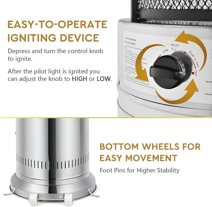 - Fast Ignition Device: Designed with the user-friendly ignition system, the patio heater is quite convenient to start up. Just depress and turn the control knob to ignite until the pilot light appears. And the knob also allows you to set the heating modes to low or high, helping you relax in the most comfortable ambient temperature.