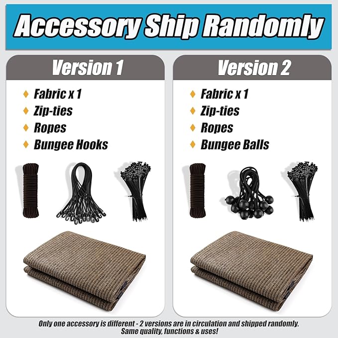 - Accessory Updated: Accessories have been updated from [Zip-ties, Ropes, Bungee Balls] to [Zip-ties, Ropes, Bungee Hooks]. Both versions are in circulation and will be shipped randomly Premium Shade Fabric: The pergola shade cloth is made of 200 GSM UV protected high density polyethylene (100% HDPE) shade fabric with strong stitched seam that resists tearing and fraying, up to 90% UV Blockage
