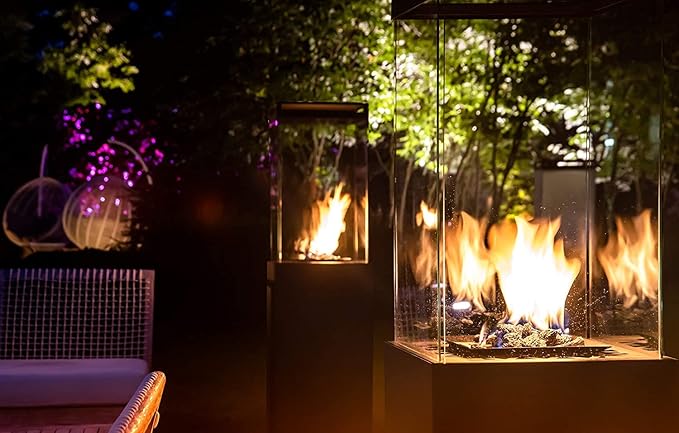 - ✅【HIGH EFFICIENCY】 The maximum gas consumption of a fire column is 0,45 lbs/h, 34K BTU. When using the standard 20lbs gas bottle, the burning time of the fire pillar is up to 45h. Comes with a gas regulator. Depending on the location of fire columns and the prevailing weather conditions, heat can be felt from 0,65 ft up to 4ft from the unit. Due to the temperature difference, the warm air emitted from our outdoor gas fireplace is directed upward according to the laws of physics.