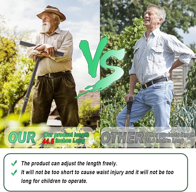 - 【Saved Money and Back】Manual auger is designed to be detachable with 2 different heads, post hole digger and twist tiller, 44.5" tall with 14" T-shaped non-slip handle, two functions for the price of one product. Non-slip T-handles provides secure, long handle eliminates sore knees from kneeling or back strain from bending. The length can be adjusted and shortened to a height suitable for work.