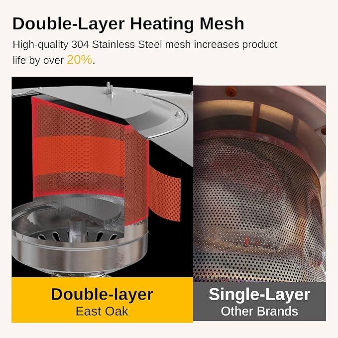 - ๐ ๐ผ๐ฟ๐ฒ ๐๐๐ฟ๐ฎ๐ฏ๐น๐ฒ ๐๐ผ๐๐ฏ๐น๐ฒ-๐๐ฎ๐๐ฒ๐ฟ ๐๐ฒ๐ฎ๐๐ถ๐ป๐ด ๐ ๐ฒ๐๐ต: High-quality 304 stainless steel is engineered into our double-cover heating mesh design. Compared with a traditional single-layer burning mesh heater, the EAST OAK Outdoor Heater is more powerful, durable, and safer. All these improvements deliver a 20% longer product life