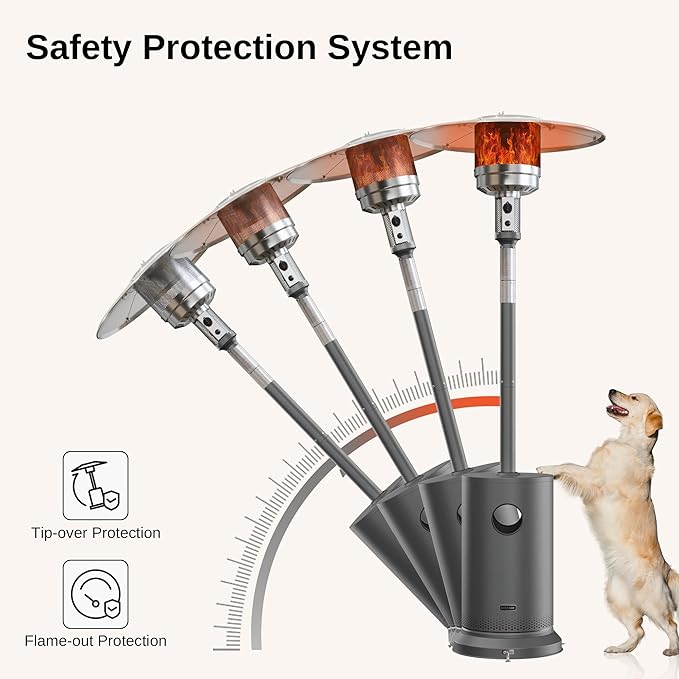 - ๐ฆ๐ฎ๐ณ๐ฒ๐๐ ๐ฃ๐ฟ๐ผ๐๐ฒ๐ฐ๐๐ถ๐ผ๐ป ๐ฆ๐๐๐๐ฒ๐บ: The Tip-over Protection system will shut off the flame when the patio heater propane is tilted more than 45 degrees. If the flame goes out, the Flame-out Protection system automatically shuts off the gas supply