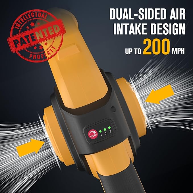 - [Patented Design Up to 200MPH] This mini blower cordless with patented design uses double-sided air inlet. It is lightweight and has a wind speed of up to 200MPH. The ultra-high wind speed mini leaf blower can easily remove those stuck and stubborn debris. 3 speeds Adjustment modes meet different usage scenarios according to your needs.