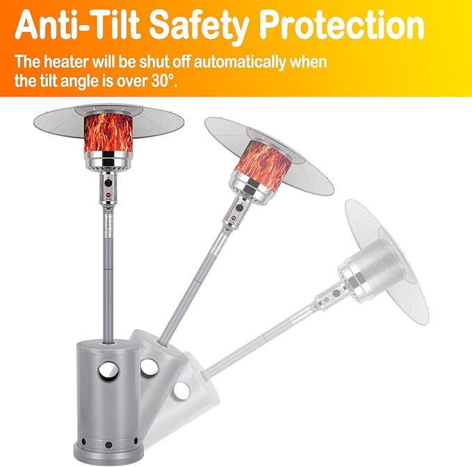 - 【Safety Design】The outdoor heaters for patio not only has high heating efficiency but also the designer has considered the safety factor in the design. One-press ignition for quick, easy starts. In particular, the umbrellalike design at the top allows for more uniform heating.The tilt protection system will extinguish the flame if the propane patio heater is tilted more than 45 degrees.