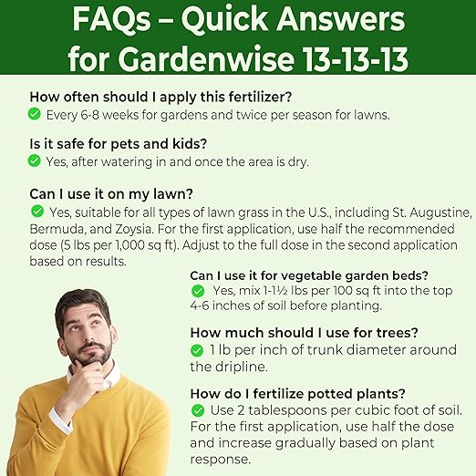 - πΏ Balanced 13-13-13 Fertilizer for Outdoor Plants: Provides 13% Nitrogen, 13% Phosphorus, and 13% Potassium for optimal growth. Perfect for lawns, vegetable gardens, rose bushes, flowers, shrubs, and trees. Ideal for St. Augustine grass, evergreens, and all outdoor plants.