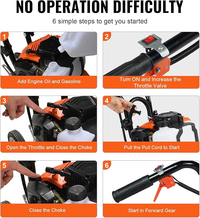 - Powerful 43CC 2-Stroke: With a 43CC displacement, this tiller cultivator provides outstanding performance for tasks in vegetable gardens, flower beds, or home gardens. It's EPA-certified for environmentally friendly and efficient cultivation.