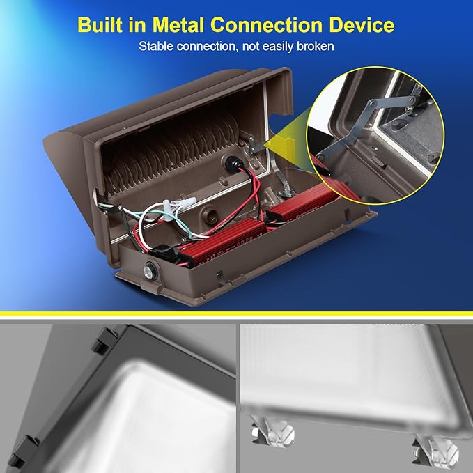 - Metal Connection Device - 120W wall pack light is connected to the front and rear covers through a metal folding hinge. Compared with traditional PC hinges, metal are more durable, have stronger load-bearing capacity, and the opening and closing of the front cover is also smoother.