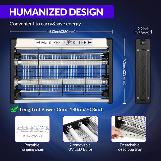 - 【 Safe and Eco Friendly 】 No any safety risk to you or the environment.Enjoy commercial strength pest control without the need for dangerous traps, repellants, poisons, sprays, chemicals or costly treatments. With protective grid to keep your kids and pets out of internal electrified grid. Its detachable grid design also allows you to replace the bulbs more portable.