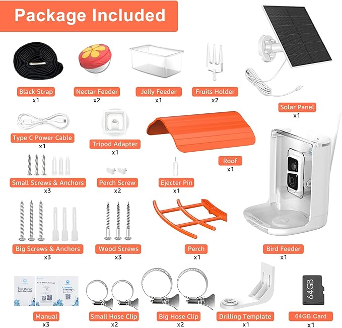 - 【5 DIY Add-ones & Squrirel-proof】The smart bird feeder come with 1.8L large capacity container and 5 different feeders: 2 fruit forks and 2 hummingbird feeders and 1 jelly box to attract hummingbirds, orioles, and other birds. With a built-in microphone and speaker, you can hear the sound of birds and repel annoying squirrels through the app