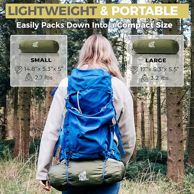 - Lightweight and Portable for Every Adventure - Our hammocks weigh only 2.7 lbs (106" x 55”) and 3.2 lbs (118” x 71”), making them ideal for hikers, backpackers, and campers. They pack down to a compact size of 14.8” x 5.3” x 5” and 17” x 5.3” x 5.5” respectively, allowing for effortless transportation