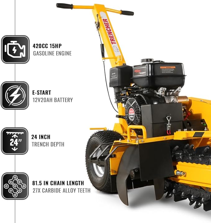 420cc 15HP E-Start Gas Powered Cable Ditching Trencher, 24'' Trench Depth, 27pcs Carbide Alloy High-Pressure Teeths, TCR1500 (Yellow)