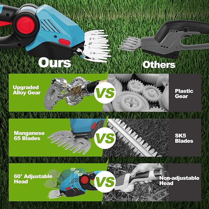 - TRIM & MOW 2-IN-1: Cordless shrub trimmer and handheld grass trimmer, two modes that can be switched at will to making your gardening tasks seamless and hassle-free. The short blade (5.1”wide) is designed for trimming lawns, small patches of grass, lawn edges and weeds, and the long blade (8.66” long) is designed for trimming edges and dead perennials, hedges and shaping shrub branches less than 0.25”thick.