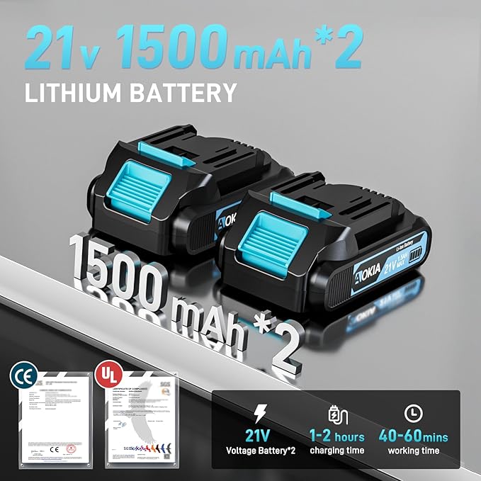 - 2 LARGE CAPACITY BATTERY PACKS- AOKIA mini electric chainsaw offer 2X 21V 1500mAh rechargeable lithium battery, which can be used for a long time.If you do not use it for a long time, please remember to fully charge the battery first, for a better experience the next time you use it.