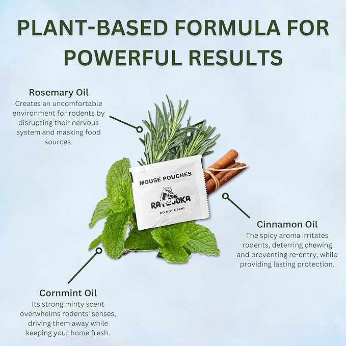 - 100% Natural Formula: Our mouse repellent pouches are formulated with all-natural ingredients derived from Cinnamon/Cornmint Oils, ensuring safety for you, your family, and pets. This natural mouse repellant acts as a convenient rodent repellent indoor barrier for any residence.