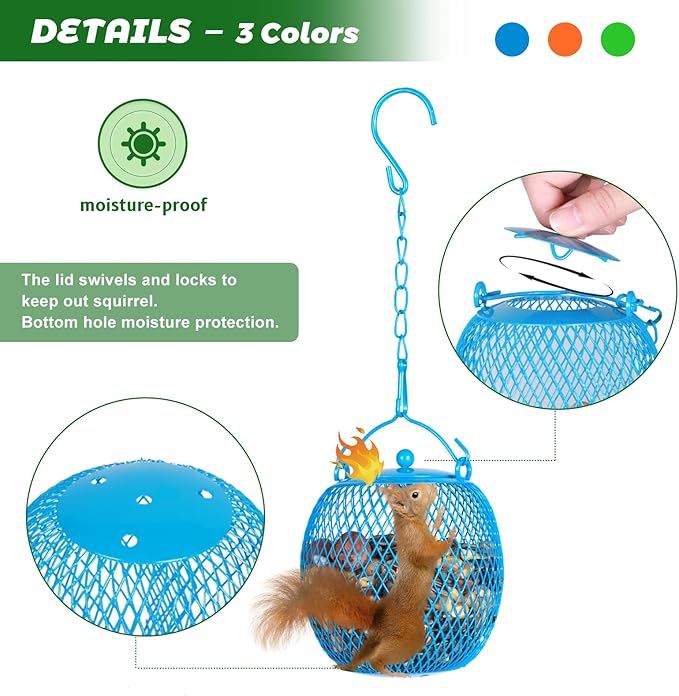 - Squirrel Resistant Bird Feeders: The hanging spherical bird feeder is a challenge for squirrels because the lid is perfectly designed so they can't bite through the feeder or open the lid to eat seeds. The birds will be the only customers the spill proof bird feeders will serve
