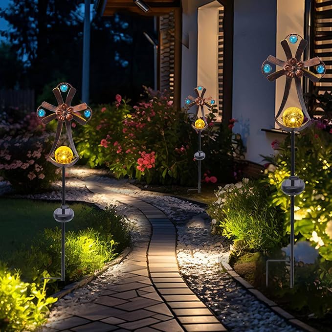 VCUTEKA Solar Garden Lights Cemetery Metal Flower Decor Colorful Solar Pathway Light with LED Cracked Crystal Ball Outdoor Decorative Stake for Patio Yard Lawn Garden Decor (Cross)