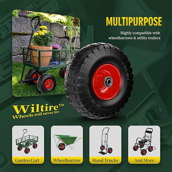 - WIDE APPLICABILITY:One of the most common tire sizes used for both commercial and home applications; 10 inch solid replacement tires for hand trucks, garden wagons, dollies, generators, snow blowers, air compressors, pressure washers, hose reel carts, garden trailers, wheelbarrows, wood chippers, lawn mowers, and light-duty equipment