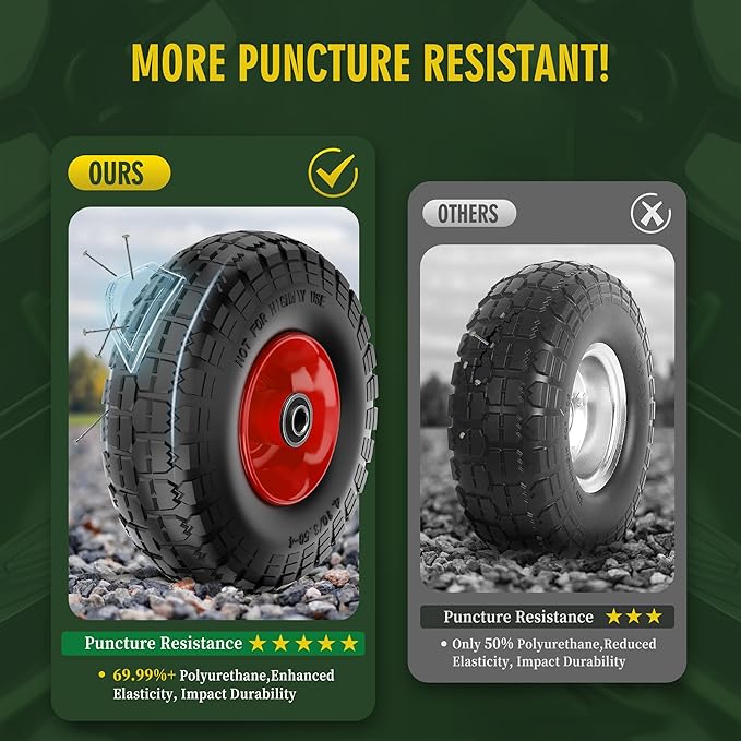 - HEAVY-DUTY SOLID PUNCTURE-PROOF WHEEL ASSEMBLIES:These run-flat tires are made with premium rubber, solid polyurethane, and engineered materials for superior wear, puncture, tear, and impact resistance. The upgraded one-piece welded steel rim offers a superior seal, ensuring durability for all-terrain use