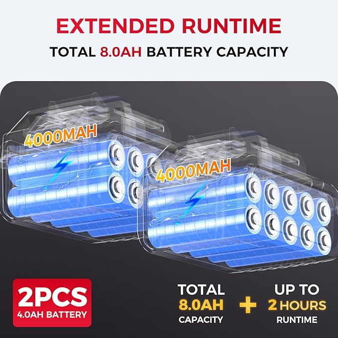 - 🔋 [LONG-LASTING BATTERIES FOR EXTENDED USE] Comes with two 4.0AH Li-ion batteries, offering up to 120 minutes of continuous operation. Swap batteries easily to finish your gardening tasks without interruptions