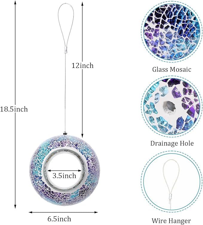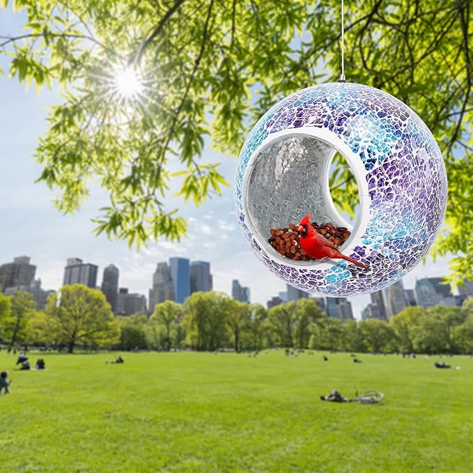 - Hanging Bird Feeder: Mosaic hang bird feeders for outdoors is made of strong mortar and glass. Birds can eat from the rim or hop inside during bad weather