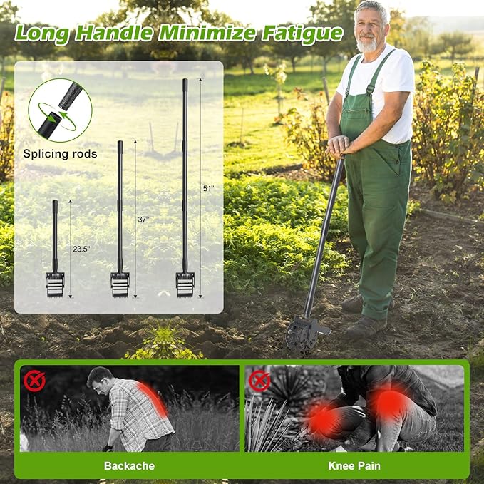- Heavy-Duty All-Metal Build to Handle Tough Soil: Crafted from durable steel and finished with anti-rust coating, this cultivator is engineered for longevity and strength. Unlike plastic or lightweight tools that warp or snap, this rugged design holds up against rocky soil, dense weeds, and repeat use