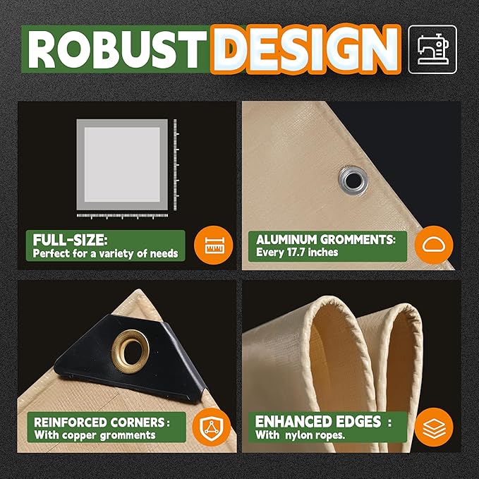 - 【FINISHED SIZE + 2025 NEW UPGRADE】The size of RAINDEWAY outdoor tarp is actual size that can be used, you will receive a full size tan poly tarp covers. If you want to have a nice and durable thick tan tarp waterproof, Please give RAINDEWAY a chance to prove that this 12mil tan tarpaulin is a good choice