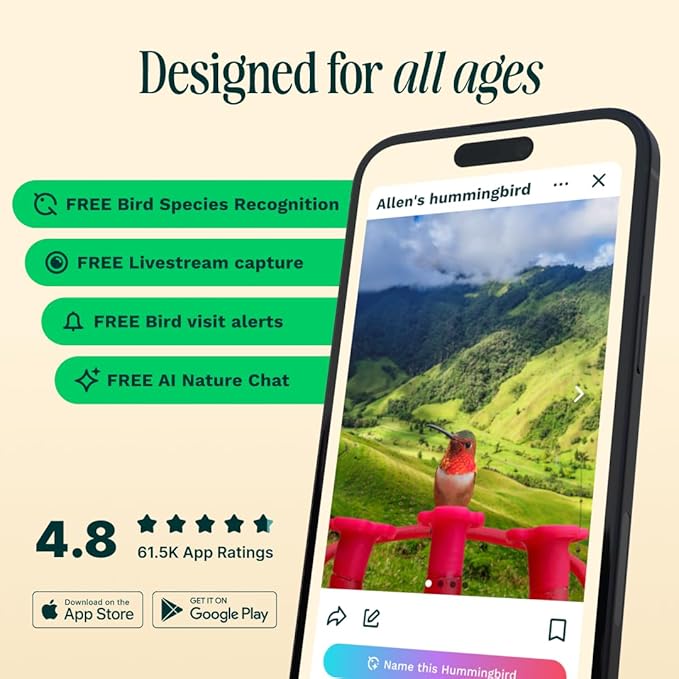 - AI-POWERED BIRDWATCHING APP: The Birdbuddy app uses AI to identify hummingbirds and other bird species, individual birds, and other animal visitors. Get real-time alerts when hummingbirds visit your hummingbird feeder and learn interesting facts about them. Enhance your experience with our Premium Subscription to easily organize photo collections and share your hummingbird photos with friends & family.