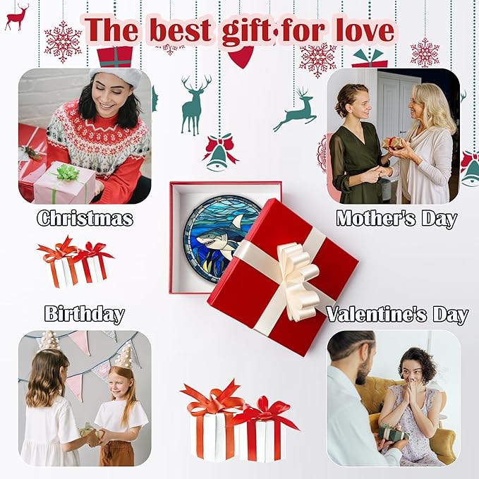 Stained Glass Suncatcher, Blue Ocean Big Shark Sun Catcher Waterweed Stain Glass Window Hanging Decoration Mother's Day Birthday Gifts for Women Men Mom Nana 15 in