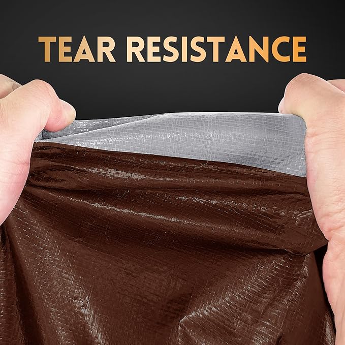 - Constructed from High-quality HDPE material, this Silver/brown Heavy Duty Tarp is 100% waterproof, wind-resistant, and delivers exceptional tear resistance. Its UV Resistant and Tear & Fade Resistant treatment ensures long-lasting performance under harsh sun, rain, and wind, making it a reliable shield for any season.