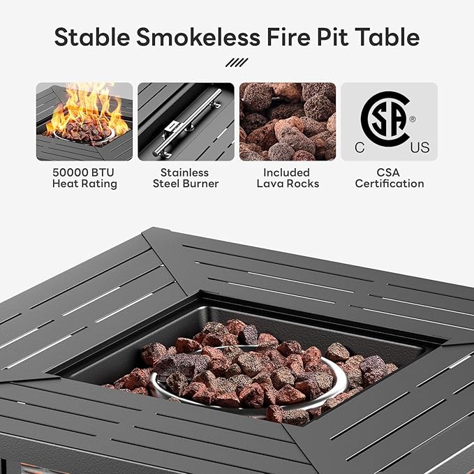 - FIRE PIT CHAIRS SET- 5 PCS Patio Furniture Set with Fire Pit Table includes: 4 swivel rockers + a 30" square firepit table. From compact patio setups to large poolside patio or yard, our outdoor furniture adapts to any space to create comfort and cohesive leisure areas.