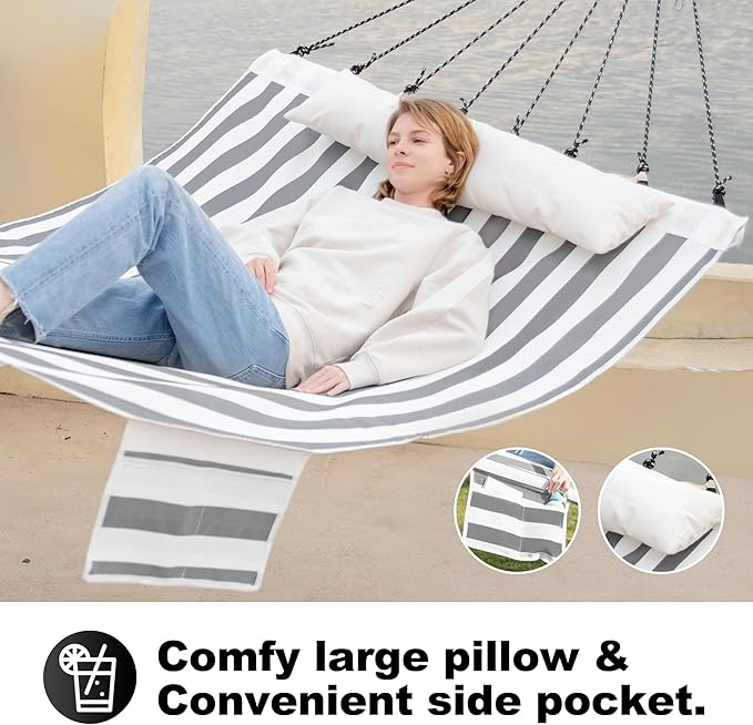 - ✅DOUBLE HAMMOCK & SPACIOUS ENOUGH TO SHARE: The comfort that comes with extra space is vital to us, and its size also boasts a wider range of versatility, allowing it to be hung from a 12-14ft hammock stand (not included) or used outdoors on its own.The hammock bed's dimension is 77" L * 57" W, the length from chain to chain is 14', larger than other quilted hammocks.