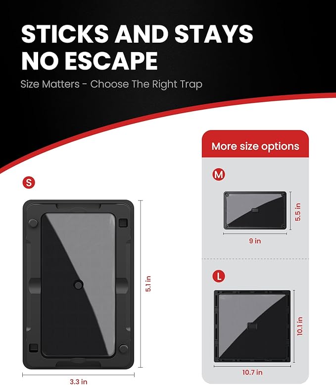 - Ready to Use and Dispose: Separate the two glue traps and place glue-side up along walls, under sinks, or behind appliances. Check daily and relocate the sticky traps after 2–3 days if needed. Once the pest is caught, just toss the entire trap—no touching, no cleanup, no stress—just clean, quiet, and effective