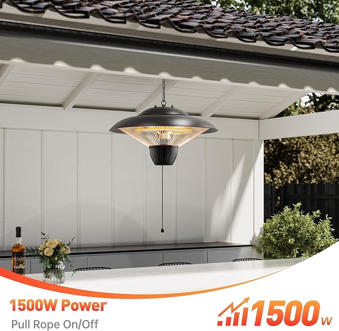 - Lightweight, Adjustable & Easy to Install : Weighing only 3.75 lbs, this portable outdoor electric heater is easy to install or move. with 2 X 20"(50cm) adjustable chain allows for optimal hanging height in your garage, gazebo, or backyard. Use it as a roof heater, space heater outdoor hanging, or chandelier heater for style and warmth.