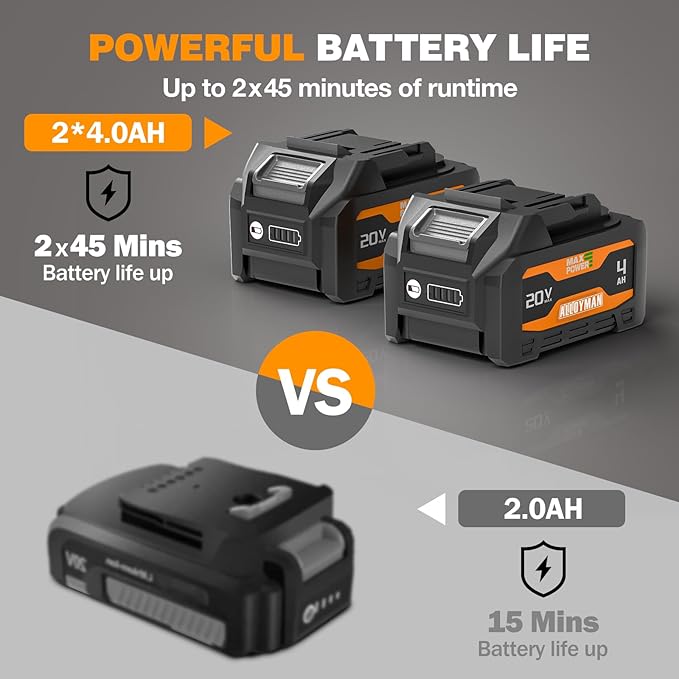 - 【2*20V RECHARGEABLE BATTERY】The powerful Li-ion with overload and temperature protection can provide a longer lifespan and make your work more efficient and convenient. A single battery lasts for 45 minutes, two batteries can be used interchangeably, reducing waiting time for your farming.