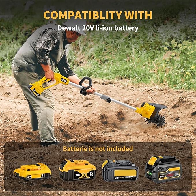 - 【Compatibility with Dewalt 20V MAX Battery】The Tiller Cultivator Compatibility with Dewalt 20V Battery, Brushless Motor, Portable Handheld Cordless Tiller Cultivator for Gardening/Soil Cultivation (No Battery) 20V MAX Battery, Plug in your own battery and get your job done fast and easy! Low-voltage protection is our first concern. The machine will automatically shut down if the battery voltage is below 14.4v to prevent any overload damage.