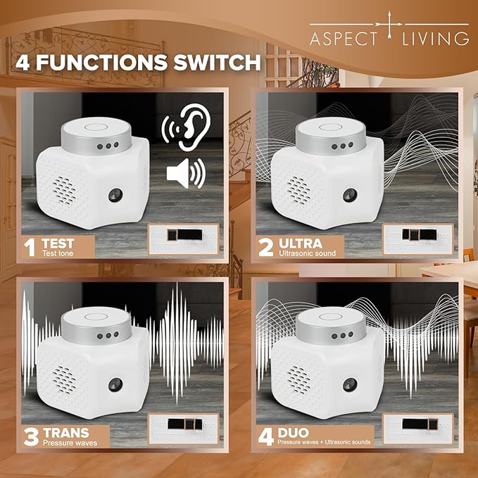 - 4 Customizable Repelling Modes-Equipped with four switchable modes—Test, Ultra, Trans, and Duo—you can adjust the device depending on your pest problem. Changing modes regularly helps prevent rodents from becoming resistant.