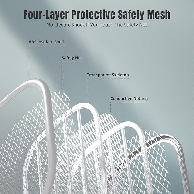 - SAFE TO TOUCH - Electric fly swatter with 3-layers mesh and double insurance switch design for safety, always keeps your hand safe from the high voltage grid. With an activation button, there’s no need to worry about accidental zapping. Widely used for home, kitchen, patio, outdoor, camping, barbecue.