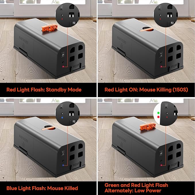 - Hygienic and Hassle-Free Disposal—This rat zapper’s minimal contact design. Dispose of mouse carcasses without touching them or smelling odors. Simply set bait, place the trap indoors, and walk away—the blue light indicates completed elimination. Easily maintain sanitation in kitchens/garages.